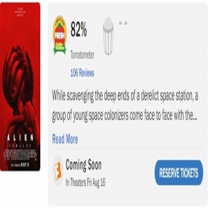 但《综艺》与《好莱坞报道》等专业媒体均给予该片好评,因为圈内人士见过太多画虎不成反类犬的例子。阿尔瓦雷斯以专业且自信的的手法将这款陈年IP包装成一部紧凑高效的惊悚片,其拳拳到肉的紧张刺激感受活像一款电子游戏。从这个角度上说,该片堪称近年最好的异形续作,周五国内国外同步首映。