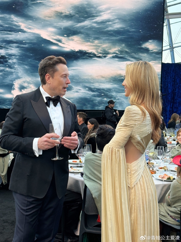 照片中,马斯克拿着酒杯与谷爱凌聊天,马斯克滔滔不绝,而谷爱凌面带笑容。